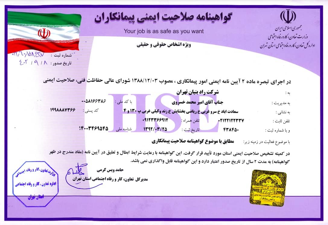 - دارای گواهی نامه صلاحیت ایمنی پیمانکاران از وزارت تعاون، کار و رفاه اجتماعی