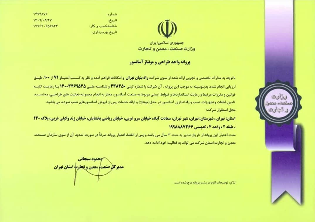 - دارای پروانه طراحی و مونتاژ آسانسور از وزارت صنعت، معدن و تجارت